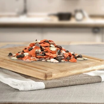 Unsere bewährte Mischung besteht aus verschiedenen, hochwertigen Früchten und Gemüsen. Die sorgsame Trocknung und luftdichte Verpackung schützt die wertvollen, natürlichen Inhaltsstoffe. Das enthaltene Obst ist selbstverständlich ungeschwefelt und ungezuckert. Daher hält der Mix länger frisch und versorgt Deinen Liebling so mit wertvollen Nährstoffen.