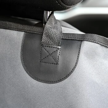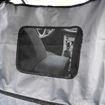 Decke kann zum Vordersitz hin per Reißverschluss geöffnet werden. Zusätzliche Befestigung an Spalt zwischen Sitz und Rückenlehne. Mit praktischen Aussparungen für die Gurtschlösser. Seitliche Schlitze für die Sicherheitsgurte.