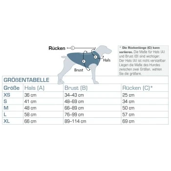 - Größe XL passt Hunden mit 66 cm Halsumfang, 89-114 cm Brustumfang und 69 cm Rückenlänge